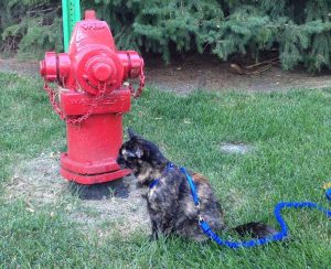 I noticed that Zim wanted to go outside, and I needed to find a way to help her experience the great outdoors. She was vulnerable because of her missing leg, so when walking in the neighborhood, she had to stay connected to a protective person. So I put a cat harness on her and attached a leash to it.